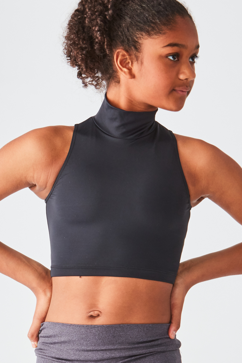 Make a statement in the Ladies Sleeveless Mock Neck Crop Top — sleek mock neck and cropped hem hit right above high‑rise tights. Perfect for jazz combos, social content, and metallic studio prints.