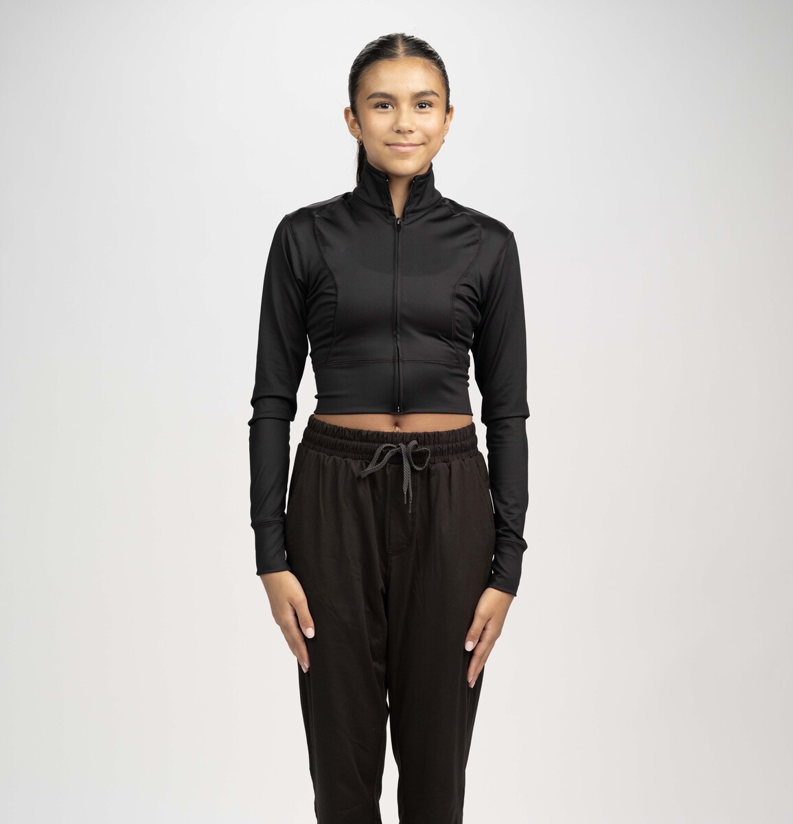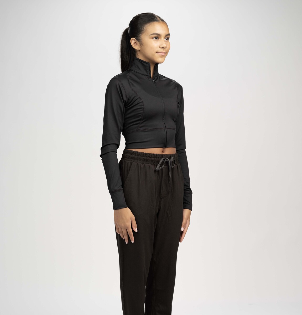 Finish strong in the Ladies Cropped Omega Jacket — tailored athletic fit with thumb‑hole cuffs and cropped length for layered looks. Perfect for teacher uniforms, street choreography, and subtle sleeve logos.