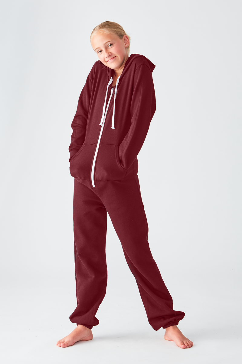 Relax everywhere in the Youth Hoodie Onesie — fleece one‑piece with kangaroo pocket turns downtime into cozy brand time. Perfect for comp sleepovers, travel bus naps, and jumbo back logos.