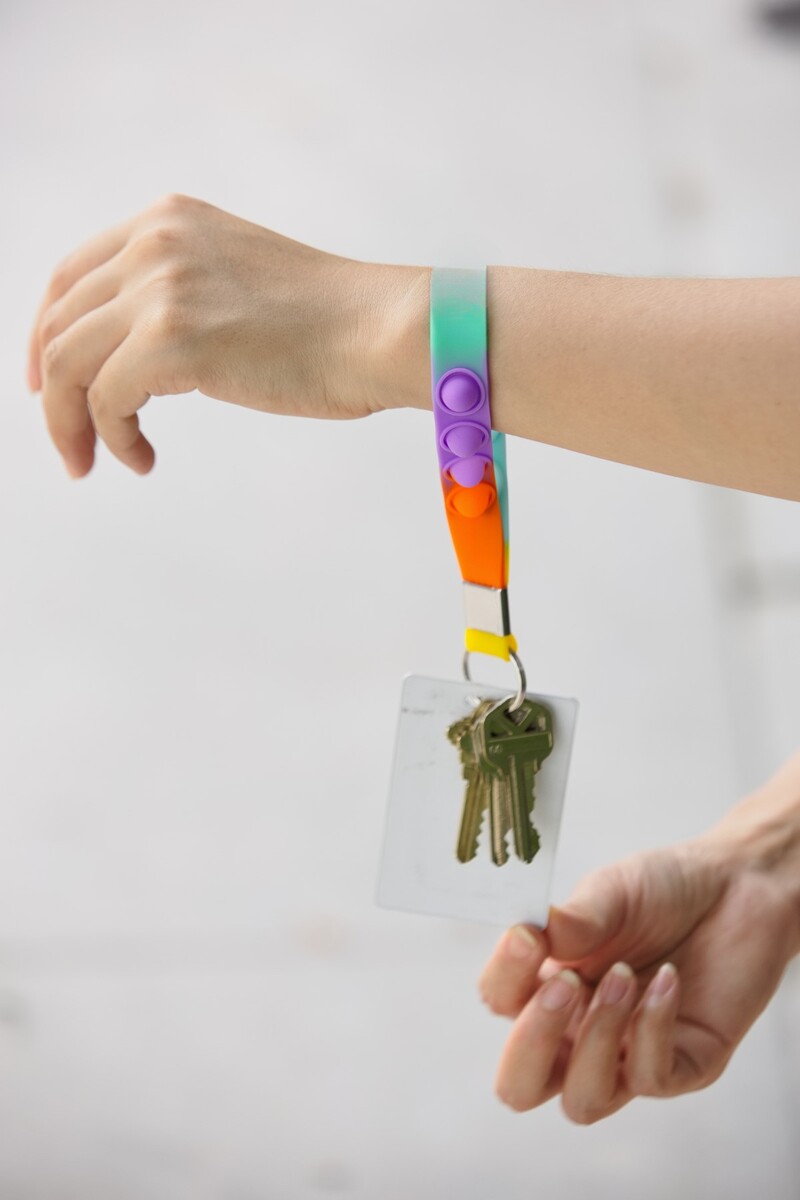 • Combines a stress-relieving pop bubble feature with a practical wristlet for keys and small personal items