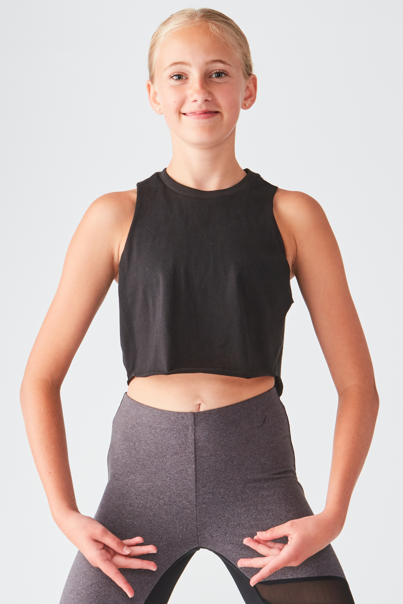 Stay cool in the Girls Crop Tank — modest crop length and wide straps that stay in place. Perfect for jazz combos, summer camps, and matching studio branding.